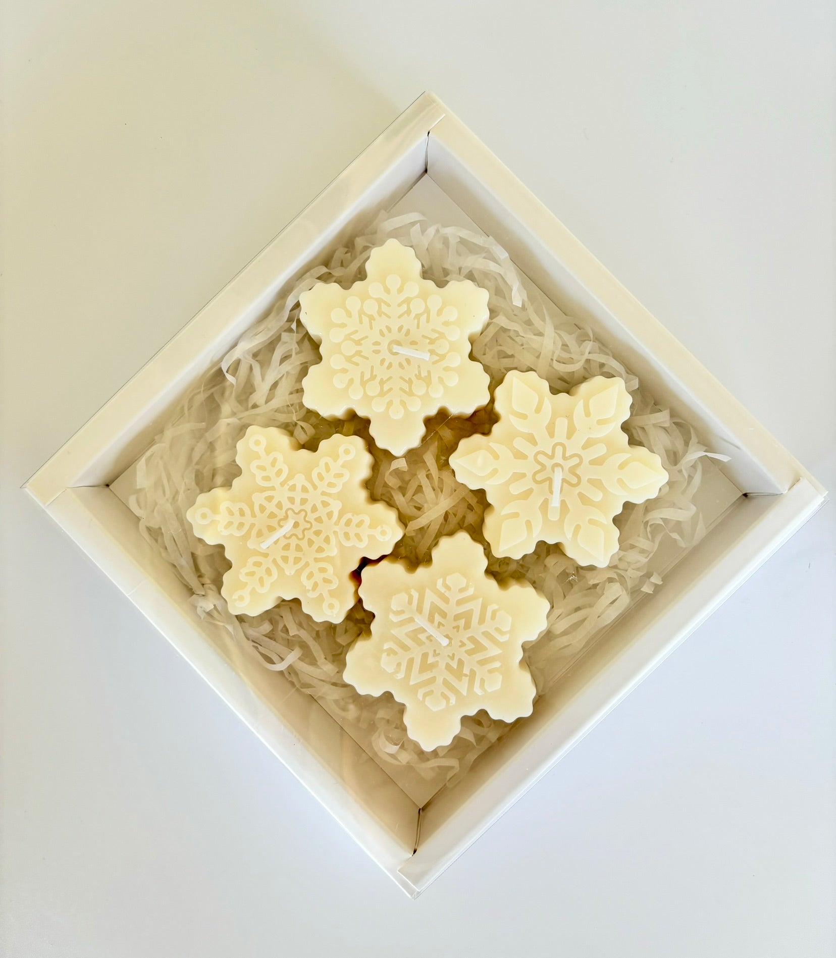 Contains 4 snowflake candles of various patterns selected at random for each box.